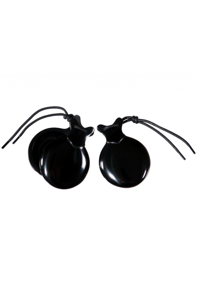 Spanish castanets compounds by thin sheets of paper impregnated specific resin. Jet black glass with high precision and powerful sound for its hardness. Touched by soloists and groups in outdoor scenarios Malagueñas rhythms, Rumba, Solea, Campanilleros ... and all forms of flamenco. Percussion seductive.