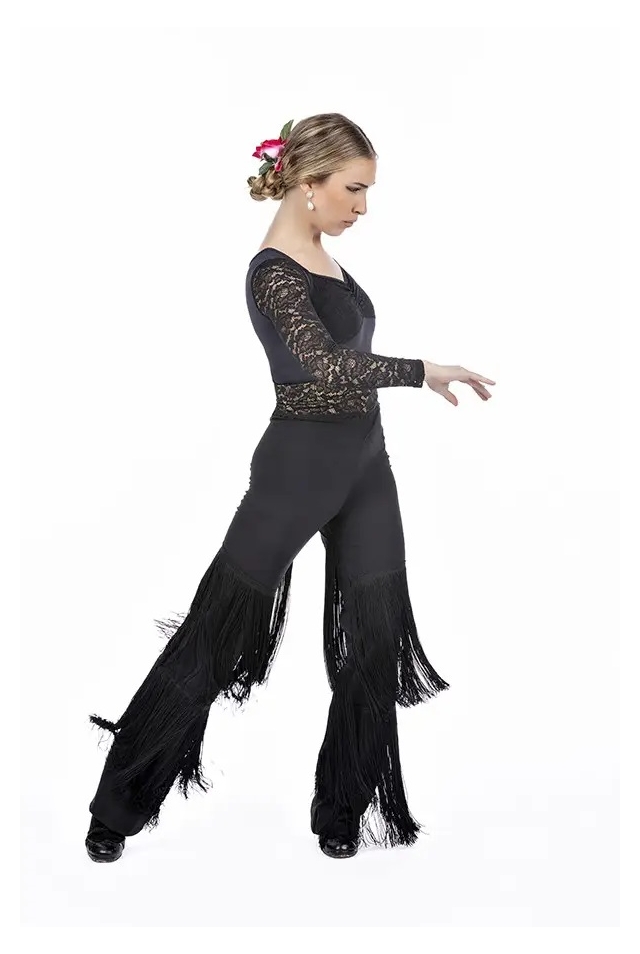 Diseñado con arte en Sevilla donde el compás se aprende antes que a caminar. Confeccionado en tejido Stringplex de gran elasticidad y recuperación, permite libertad de movimiento durante el baile. En su diseño destaca un fajín integrado de encaje sobre base de lycra color carne, y líneas de flecos largos en cada pierna. Funcionalidad técnica y belleza escénica