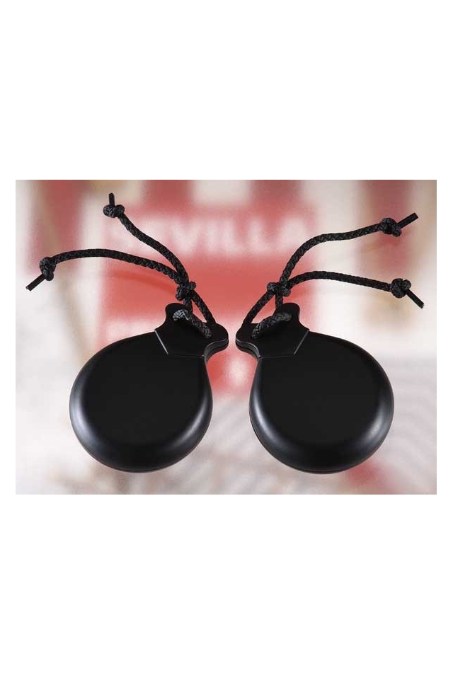Castagnettes de flamenco en fibre mate, à base de bandes en papier imprégnées de résines. Filigrane noir mate avec finition vieillie pleine de sagesse, laquelle prospère a travers leur percussion. Son profond avec pincement, bruyant, vibrant, offre au public de la festivité et jovialité durant les représentations musicales